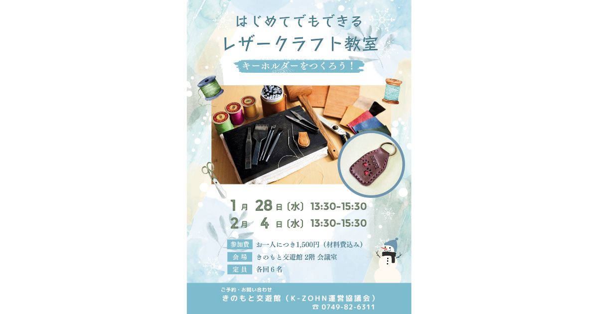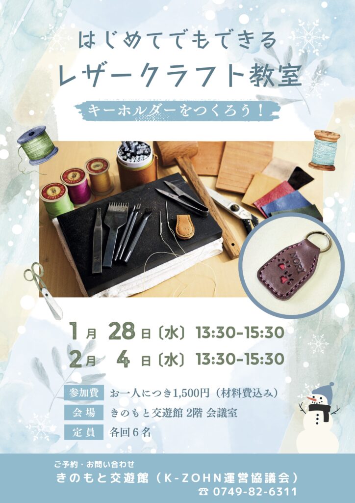 木之本在住の藤田能理子さんによる「レザークラフト教室」を開催します。今回のテーマは、「キーホルダー」。皮の切り出しからご自身でチャレンジ、縫うだけでなく、ポンチで穴を開けたり、文字の刻印を押したり、好きなデザインに仕上げてください。
